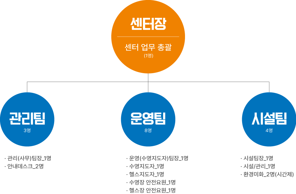 센터는 효율적인 운영을 위해 총괄(센터장) 아래 관리팀, 운영팀, 시설팀으로 구성되어 있습니다.